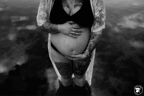 Hier een plus size zwangere buik vol met “glinsterstreepjes” (zoals mijn ma ...