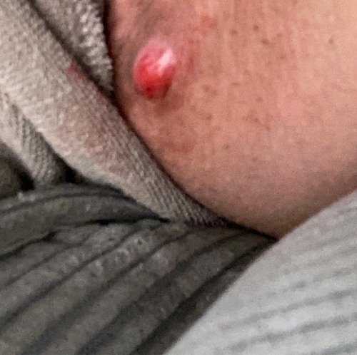 Dat ziet er heel erg pijnlijk uit! Ik had na mijn eerste bevalling een soortgelijke bult maar dan onder mijn oksel. Na een paar dagen kwam er allemaal pus en bloed uit en 't deed super veel pijn.