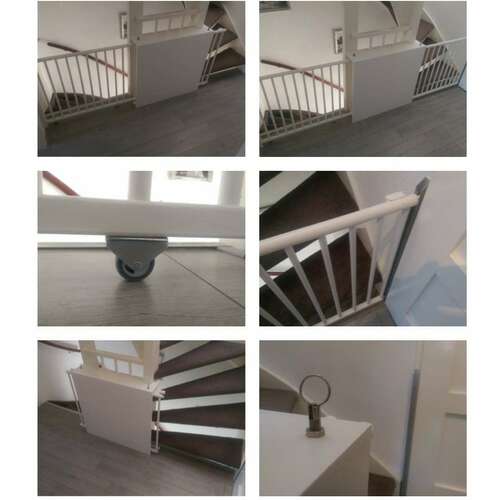 Ik wil ook graag een schuifsysteem op overloop van de eerste verdieping, dan hebben we 2 trappen naast elkaar (eentje naar beneden, eentje naar boven), zoiets lijkt me dus echt ideaaaaaal (zie foto). En dan zou ik er ook nog een kattenluikje in willen 馃樅 waarom is zoiets niet gewoon op de markt gebracht? Er zijn veel huishoudens met katten, en 2 trappen. Met open schuiven naar opzij scheelt het ook dat je niet om dat hele geopende hek hoeft te lopen (is bij ons weinig ruimte voor).
