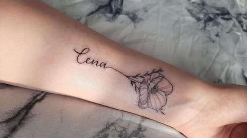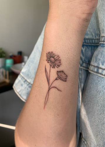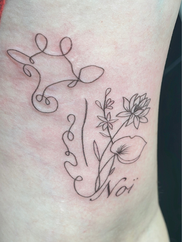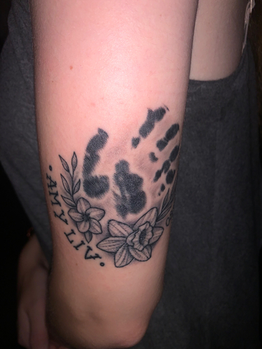 En de lettertype van haar naam (Oldskool tattoo style lettertype) past weer bij mijn andere tattoos die wat meer oldskool zijn. Maar wou echt iets rustigere meisjes achtige tattoo voor onze dochter wat wel bij de rest zou passen wat ik al heb