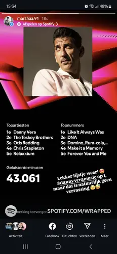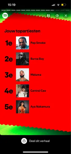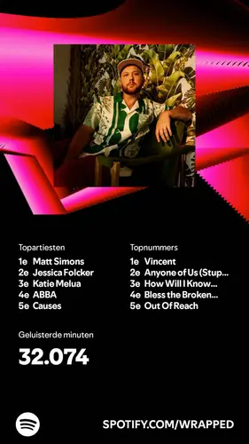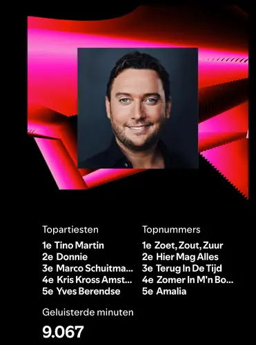 100%. Ik heb dit jaar 510minuten geluisterd. Of te wel. Ik heb Spotify niet echt gebruikt en heb het bijna alleen maar op m’n werk gebruikt (kdv). En bij mij staan echt artiesten in de top 5, die ik misschien 1x geluisterd heb in een top 50 lijst ofzo 😂