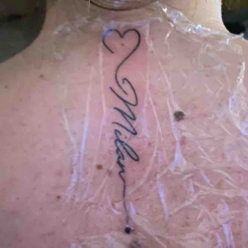 Ik heb de naam van de oudste (10 jaar) op mijn vinger.. En de naam van de jongste (1 jaar) op mijn pols.. Daar tussenin, klein stukje over mijn hand een subtiele pijl richting beide namen, zodat ze verbonden zijn met elkaar..