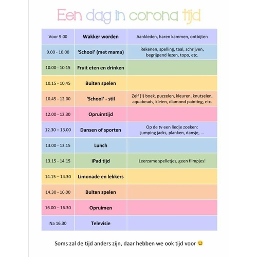 Ik ben groot voorstander van zoveel mogelijk het standaard rooster aanhouden. Het is geen vakantie en ze krijgen vanaf morgen schoolwerk. Straks lopen ze zo erg achter dat ze alles in de zomervakantie in moeten halen, dat wil ik ze besparen. Overigens hebben ze het geluk dat ik de pabo doe en ze dus wel goed kan helpen. Ze zouden ook mogen uitslapen, maar dat gebeurt hier toch niet haha (zijn 10&6). We hebben nu nog geen schoolwerk en ik weet ook niet hoeveel ze straks gaan krijgen, dus daar zijn de tijden uiteraard een beetje van afhankelijk.