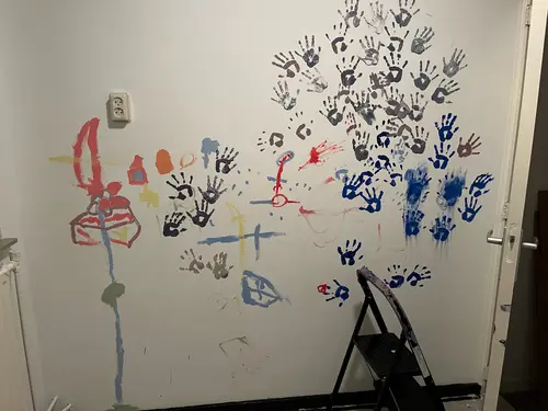Het is een woning met 4 slaapkamers, en de 4e (kleine) slaapkamer ga ik ombouwen tot Kledingkamer. Dus ik dacht, waarom niet de oudste lekker haar gang laten gaan met verf? Dit wordt de āregenboog kledingkamerā. Er komen allemaal planken en een rek om kleding aan te hangen, maar verder blijft de deur dicht dus van mij mag dit lekker druk zijn haha! Ik maak er een soort mega inloopkast van āŗļø