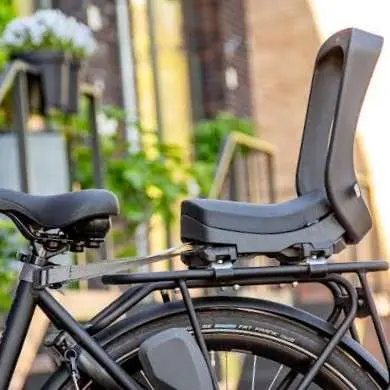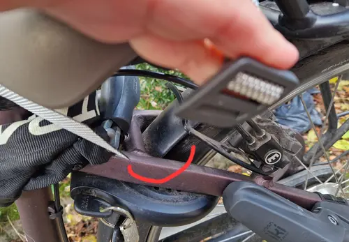 En (gewoon voor de zekerheid, want het zou een beetje lullig zijn) heb je ook echt de veiligheidsband? Onder de zitting zit een bandje die er hetzelfde uitziet, maar bedoeld is als gordel voor je kind. Die is zeker te kort om om de zadelpen of frame te doen.