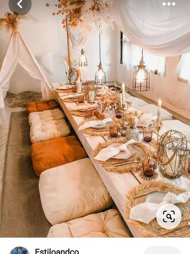 Een bohemian bday dinner, met een setting zoals op de foto. We beginnen met een cacao ceremonie (ja ik ben lekker spiritueel ingesteld馃榿!), waarbij we allemaal een wens/intentie/iets liefdevol naar de ander kunnen uitspreken en mooie oefeningen doen om ons hart te openen. Mijn moeder haar kennis maakt taarten (Chantilly, echt een aanrader!!) dus kunnen we daarna lekker van de taart snoepen. Om al die lekkernijen te compenseren sluiten we de avond af met een workshop: twerken馃お!! Gegeven door m'n vriendin! Na het twerken is er ruimte om nog lekker te kletsen, dansen en een drankje te doen. Daarna iedereen lekker naar huis en gaat moeke voldaan naar bed hahah. Wat vinden jullie van dit idee? Ik zie het wel zitten馃槏