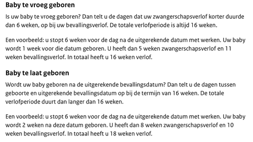 Als je later bevalt dan uitgerekend en je bent 6 weken voor je uitgerekende datum met verlof gegaan, dan kan het dus zijn dat je totale verlof langer is! Zie de voorbeelden in het artikel.