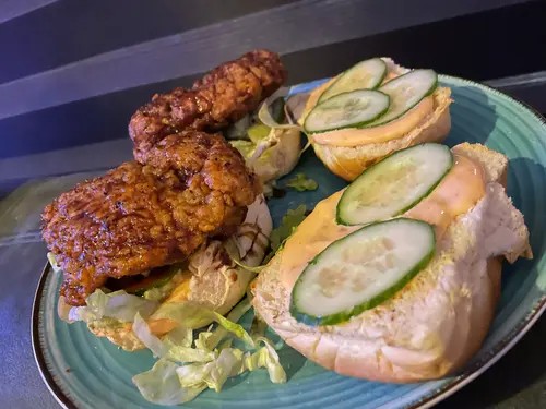 Geroosterde tomatensoep met erbij een stokbroodje en kleine hapjes 😋