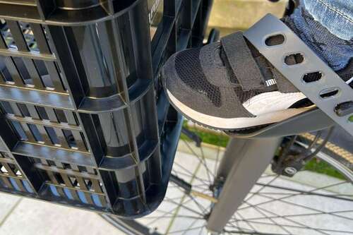 Je hebt een speciale bout om je voordrager te verlengen dat geeft ruimte voor de voetjes van je stoeltje. Moet zeggen dat ik zelf uiteindelijk toch het kratje eraf heb gehaald vanwege het zwengelen maar dat is uitproberen wat je fijn vind.