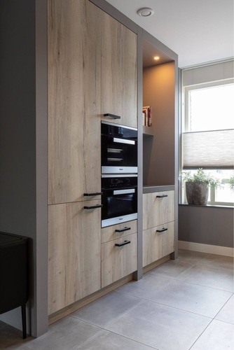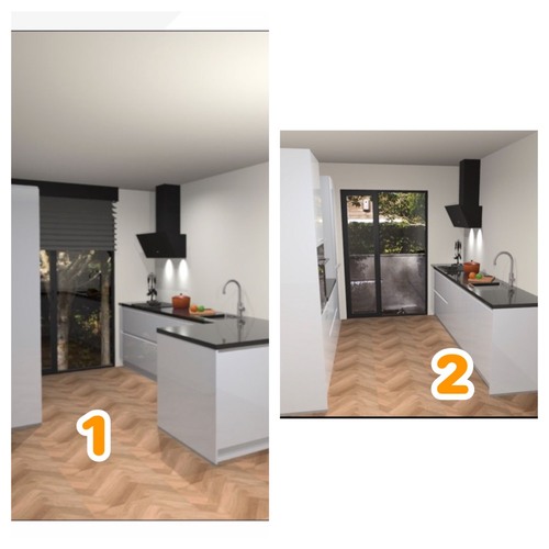 In dat nisje kan je bijv mooi je koffiezetapparaat en waterkoker kwijt . Anders staat dat bij optie 1 zo in het zicht op het aanrecht en wordt het rommelig. Ik vind optie 2 ook leuker doordat het wat ruimtelijker overkomt. Stel je zet nog een keukentafel in de buurt neer, dan wordt het erg vol bij optie 1