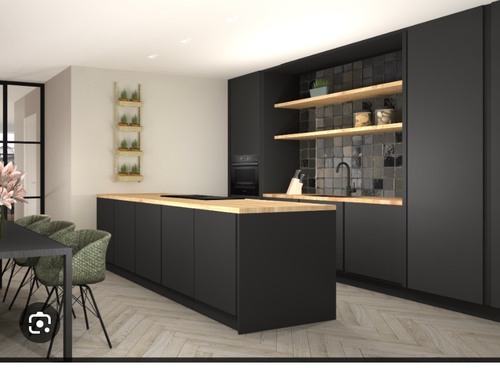 Ik zou zelf geen zwarte keuken kiezen omdat ik daar snel op uitgekeken ben, ik doe liever kleur op de muren want dat kan je makkelijker veranderen.