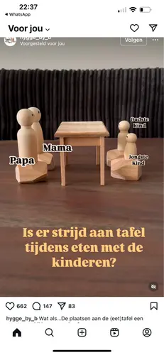 Mijn man en in zitten tegen over elkaar. Naast mij zit onze 2e zoon. Tegen over hem en naast mijn man dus zit onze 1e zoon. En onze 3e zoon zit aan de kopse kant tussen mijn man en ik in zodat we hem allebei kunnen helpen als dat nodig is. Ik ben nu zwanger van nummer 4 en ik denk dan dan mijn man en ik in het middag gaan zitten tegenover elkaar ( wij hebben een 6 persoons tafel) en dan dan de 3e zoon naast papa komt te zitten en de 4e naast mij.
