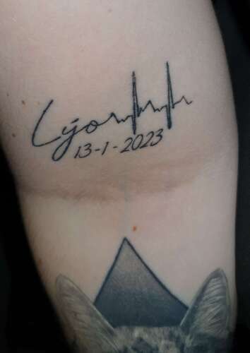 Verder heb ik op mijn bovenarm boven de elleboog plooi een zonsopkomst met daaronder in romeinse cijfers de geboorte datum van mijn dochtertje. Wij kalmeren haar altijd door "you are my sunshine" te zingen. Ben er nog niet helemaal uit of daar gewoon een 2e datum bij onder komt of dat ik op mijn andere arm een extra tattoo doe.