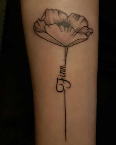 Ik heb de geboortebloem van de maand augustus met zijn naam laten zetten op mijn onderarm.