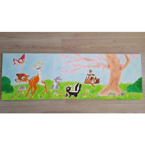Zelf gemaakt schilderij. Ik heb eerst een thema bedacht (bambi). Daarna welke dieren ik erop wilde en heb ik per dier plaatjes opgezocht op Google, ook van de boom. Deze vervolgens nagetekend en er een mooi geheel van gemaakt. Ben er best wel trots op 馃榾