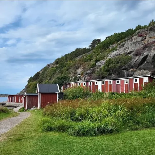 Een verstopte badplaats bij een woonwijk met idyllische Zweedse hutjes. Er zit een grasveldje met parkeerplaats bij: