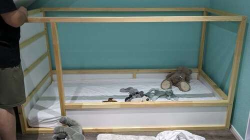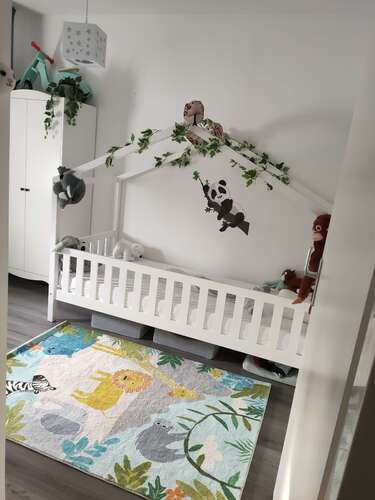 Dit 1p bed staat sinds een paar weken. Bijna twee, maar hij slaapt 's nachts nog bij ons en overdag oefenen we nu in dit bed. Als hij hier 's nachts ook zou gaan slapen tzt dan monteren we nog een balk/stang ofzoiets