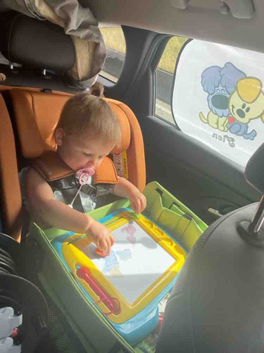 Het tekenbord is ook een schot in de roos hier (zoontje van bijna 3). En verder een koptelefoontje zodat hij "zijn" muziek kon luisteren en wij ondertussen de onze voorin. En een goed gevulde snackzak en cadeautjeszak hielden de vaart er ook wel in. Al met al viel het me reuze mee.