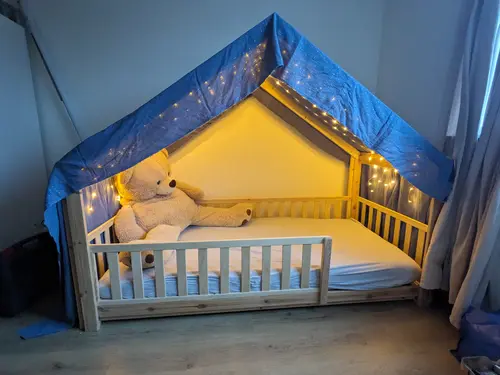 Hier heb ik onlangs bedhuisje gekocht en toevallig vandaag in elkaar gezet! Als je helemaal naar beneden scroll, zie je een leuk gordijn voor eroverheen 😊. Ook zie je bij al die bedhuisjes wat versieringen/verlichting ter inspiratie, maar die zijn daar (volgens mij?) niet te koop. Dat gordijn hebben wij eroverheen, maar vooralsnog is dat het enige want vandaag is de eerste dag dat ze erin slaapt hihi. Nog even wachten met de prikkels.