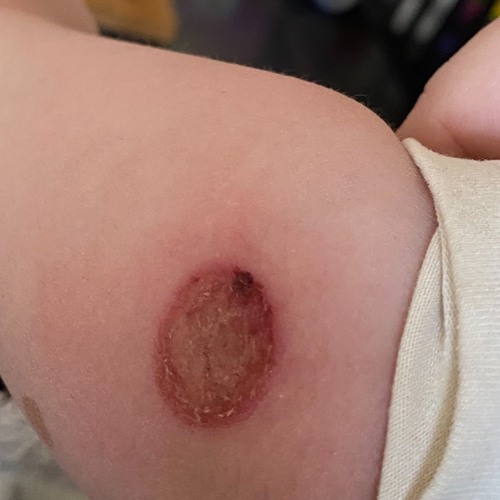Zoals gezegd: direct de huisarts bellen hoor! Dit is voor zo’n kleintje een grote brandwond.