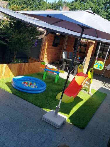 Dit is bij ons nu de situatie, zwembadje met ballenbak ballen (als het warm is met water er in ofcourse) watertafel, glijbaan en een schommel onder het afdak. Wil binnenkort ook nog zo'n zandbak schildpad halen. En dan ben ik er wel klaar mee馃ぃ