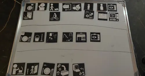 De prenten die jij gebruikt idd. Ze hangen op school op 2 rijen: voormiddag en namiddag ( 2 houten plankjes) in de lengte. De plankjes hebben elk een andere kleur. Heb je de sclera app op je computer gezet?: pictoselector. Top app