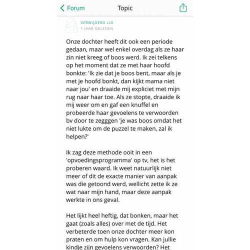 Tips heb ik niet, kan je alleen maar zeggen dat het goed komt en dat je niet de enige bent. Heb het zoveel mogelijk genegeerd omdat ik ook wel zag dat hij het deed om een reactie bij ons uit te lokken. Zag een keer dat hij eerst naar ons keek, of wij wel keken, en dan pas ging bonken. Het is echt lastig. Bij het kdv vonden ze het ook erg lastig. Ik denk dat het bij hem is opgehouden toen hij zijn gevoel wat beter bespreekbaar kon maken. Ik heb ook veel met hem gepraat over gevoelens en boze buien op advies van de pedagogisch coach op het kdv. Hij zegt nu na een peuterdriftbui : was een beetje boos!