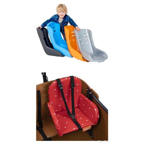 Bij mij zit er een tuigje in de bakfiets. Dan zit ze dus vast op het bankje maar zonder extra schaal of zitje. Lijkt mij voldoende
