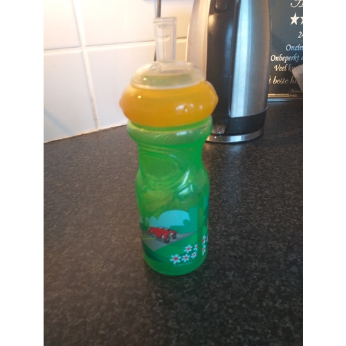 Wij hebben hier ook een beker/fles met een rietje erin. Hij lekt niet want als je niet zuigt komt er niks uit.