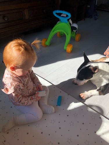 Als onze zoon aan het spelen is op de grond dan komt ze vaak even kijken. Ze mag op afstand kijken, dus ze gaat vaak in de buurt liggen. Soms als ze wil spelen dan komt ze hem ‘vragen’. Dan gaat ze om hem heen rennen met een balletje en die gooit ze dan voor hem neer. Of ze gaat voor hem staan met een knuffel in haar bek, en dan moet hij die vast pakken en trekt ze hem over de grond vooruit. Dus ze hebben het gelukkig ook wel eens leuk samen.