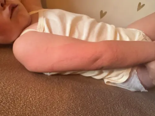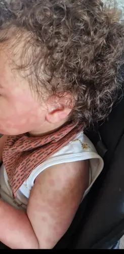 Mijn zoon heeft dit vanaf dat hij paar weken oud is. De 1e keer waren we toevallig bij de kinderarts toen dit gebeurde maar het trok vrijwel direct weer weg. Soms komt het op en gaat het weg. Soms is het heel extreem (zit hij van top tot teen onder) en krijgt hij er speciaal drankje voor. Ook smeren we er koelzalf op. Hier een foto hoe het bij mijn zoon eruit kan zien.