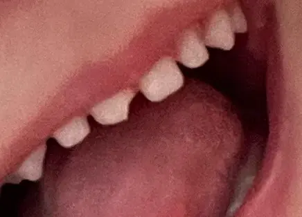 Ik zou wel laten controleren of er geen scherpe randjes zijn waar ze haar lip en tong mee open kan halen.