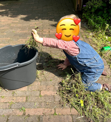 Mijn oudste liep pas toen ze 20 maanden was. Daarvoor kroop ze op hoog tempo de hele tuin door. Zowel over het gras als over stenen. Ik trok haar meestal een tuinbroek aan van jeansstof. Vooral ter bescherming van al haar andere broeken, en niet zo zeer haar knie毛n. Ruwe/rode knie毛n konden haar namelijk totaal niet deren. Kapotte handjes heeft ze nooit gehad. Ook toen ze nog niet liep vond ze het al leuk om te helpen met tuinieren 馃馃徏