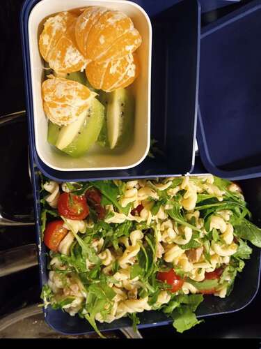 Pastasalade met komkommer, tomaatjes, olijfjes, beetje olijfolie