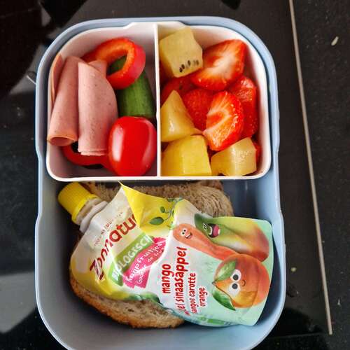 Bij fruit een halve paprika en lunch 2 broodjes beleg en handje nootjes. Elke dag altijd 😆 doen we wat anders eet ze het niet op