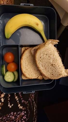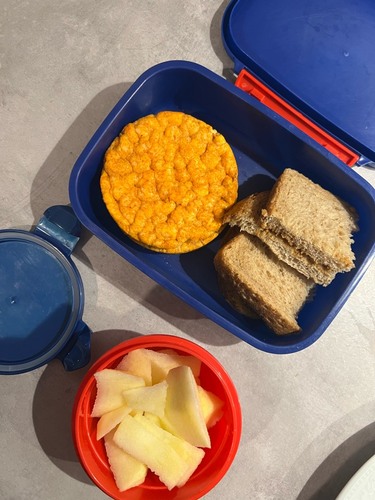Ik heb geen foto, maar in de ochtend krijgt ze meestal fruit mee. Favoriet is appel met kaneel. Op woensdag mag ze een koekje mee, dan is ze enorm gelukkig dus vooruit.