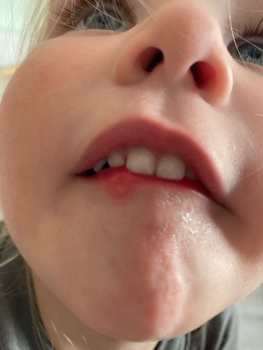 Wat evt kan; Een blaartje, per ongeluk gebeten, gestoten, krentenbaard .. hand mond voet ziekte maar verder zie ik geen plekjes.. zelfs gebeten worden door een mug op je lip kan zo’n reactie geven..