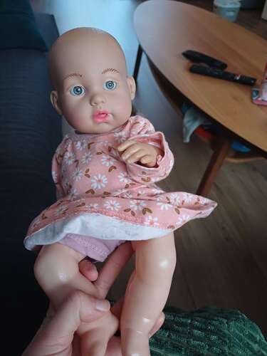 Deze is van de action niet de originele kleren en ze zit in een maxi cosi ze heeft dan fluor roze pakje met een strikje aan.