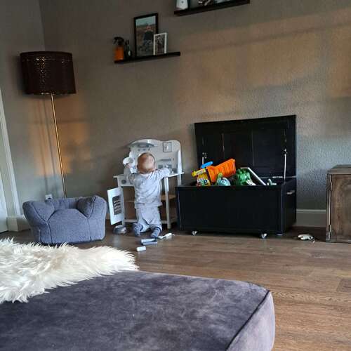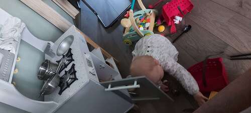 Hier kreeg de oudste het keukentje rond 1 jaar (had een leuke op marktplaats gezien). De jongste speelt er al mee sinds dat ze zichzelf kan optrekken > 7 maanden 😅