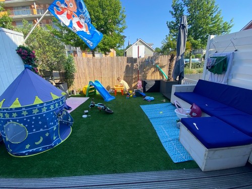 We hebben ook een kleine watertafel, plastic glijbaan en een speeltent.