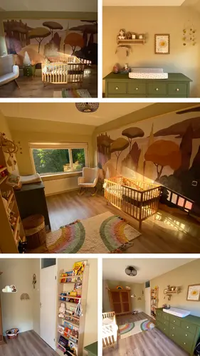 Dit is de babykamer van mijn zoontje. Niet zo kleurrijk als die pinterest, maar wel heel uitgesproken door het behang. Wellicht ook interessant?