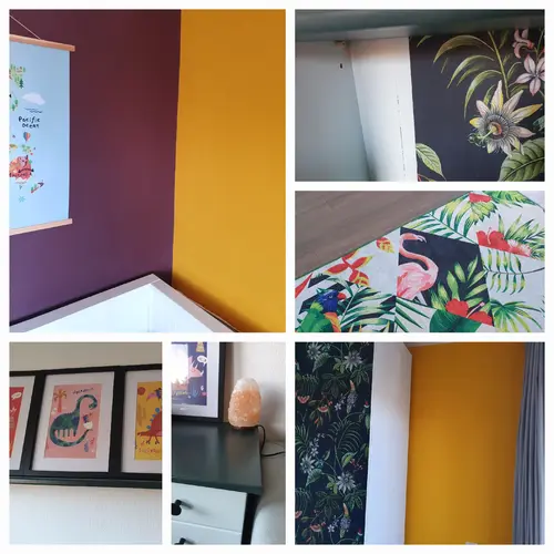 Zoon heeft 1 muur okergeel en 1 muur aubergine. 2 muren wit. Het bed wit. ...