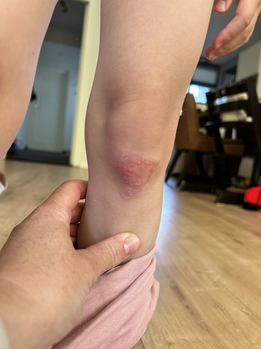 Wij hebben dit ook precies zo'n grote plek bij de knie. Op de wang en neus. ...