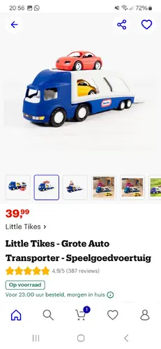 Die grote vrachtwagen met 2 autos van little tikes is geweldig.