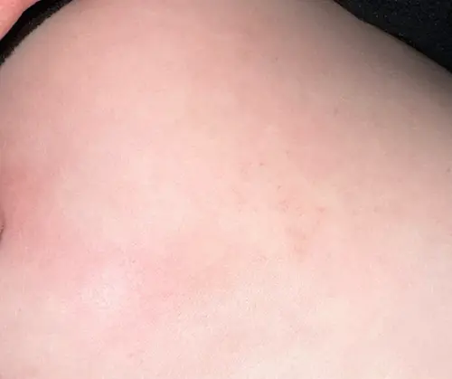 Mijn dochters hebben dit ook snel na iets te ‘hard’ spelen, ook wel veel heftiger dan op jouw foto. Bij de oudste ook wel eens zorgen om gemaakt en er is bij haar ook bloed afgenomen om bloedbeeld te checken, maar de artsen maken zich alleen zorgen als ze daarbij ook suf zijn, koorts hebben, nekstijf (alle andere symptomen van meningitis).