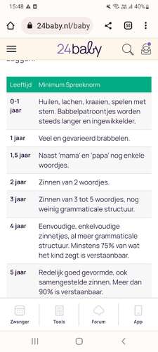Hier zie je de "richtlijnen" trouwens. Eerste woorden voor de eerste verjaardag zijn dus totaal geen norm. Ook ken ik kindjes die dan wel al mama papa zeggen, maar erna trager evolueren, terwijl mijn zoon laat was, maar snel vooruitging. Net zoals bij andere mijlpaaltjes dus.