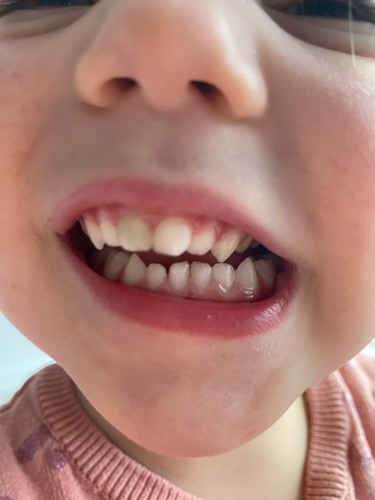 Is ze een keer hard op haar mond gevallen? Kan ook daardoor komen… en anders misschien even telefonisch overleggen met je tandarts