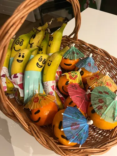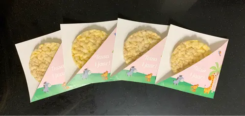 Ik heb knijpfruitjes gedaan, met een printable wikkel (op gekleurd papier geprint) en een "roltoeter" erop geplakt.