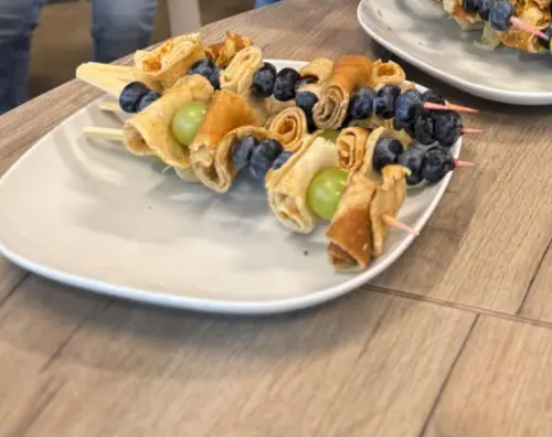 Leuk! Maar mocht deze wel ivm verstikkingsgevaar? Opgerolde pannenkoeken en druiven kunnen beter worden gesneden