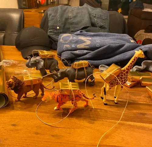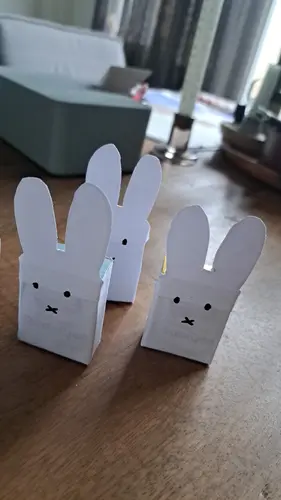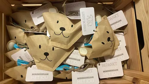 Wij hebben rijstwafel schaapjes gemaakt. Vershoudfolie erom (kon niks anders bedenken dan plastic helaas), hoofdje en pootjes an papier geknipt, met witte pen er een gezichtje op getekend, aan elkaar geplakt en klaar is kees. En voor ieder kindje een klein bellenblaas je erbij. Maar ze zijn ook maar met een stuk of 10 kindjes. Kan evt ook met chocolade wafels, lekkerder maar minder gezond.